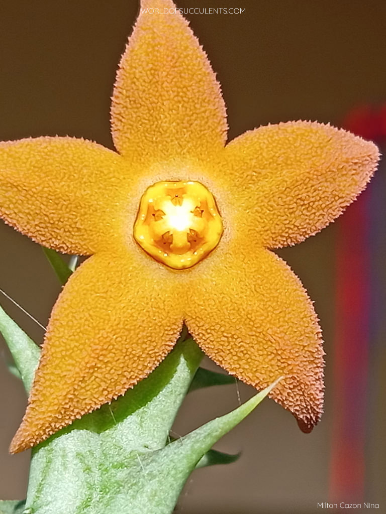In the fall, Orbea sprengeri produces attractive, yellowish-brown flowers on very short stalks. The corolla of the flowers is rotate and can reach a diameter of 1 inch (2.5 cm).